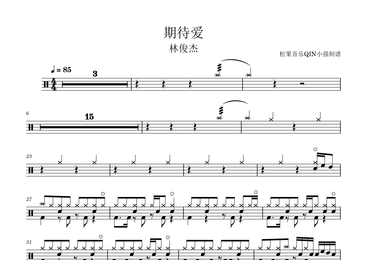 《期待爱》是林俊杰演唱的一首歌曲,拍号为4/4拍,这份架子鼓谱共有两张高清图谱,图谱由 @松果音乐QIN小强 编配上传,图谱使用五线谱编配,使用这份期待爱架子鼓谱,你将能够轻松地敲打出这首林俊杰的期待爱,快来尝试吧。《期待爱》是林俊杰和金莎合唱的歌曲,由林怡凤、许环良作词,林俊杰作曲,首发于2008年1月21日。