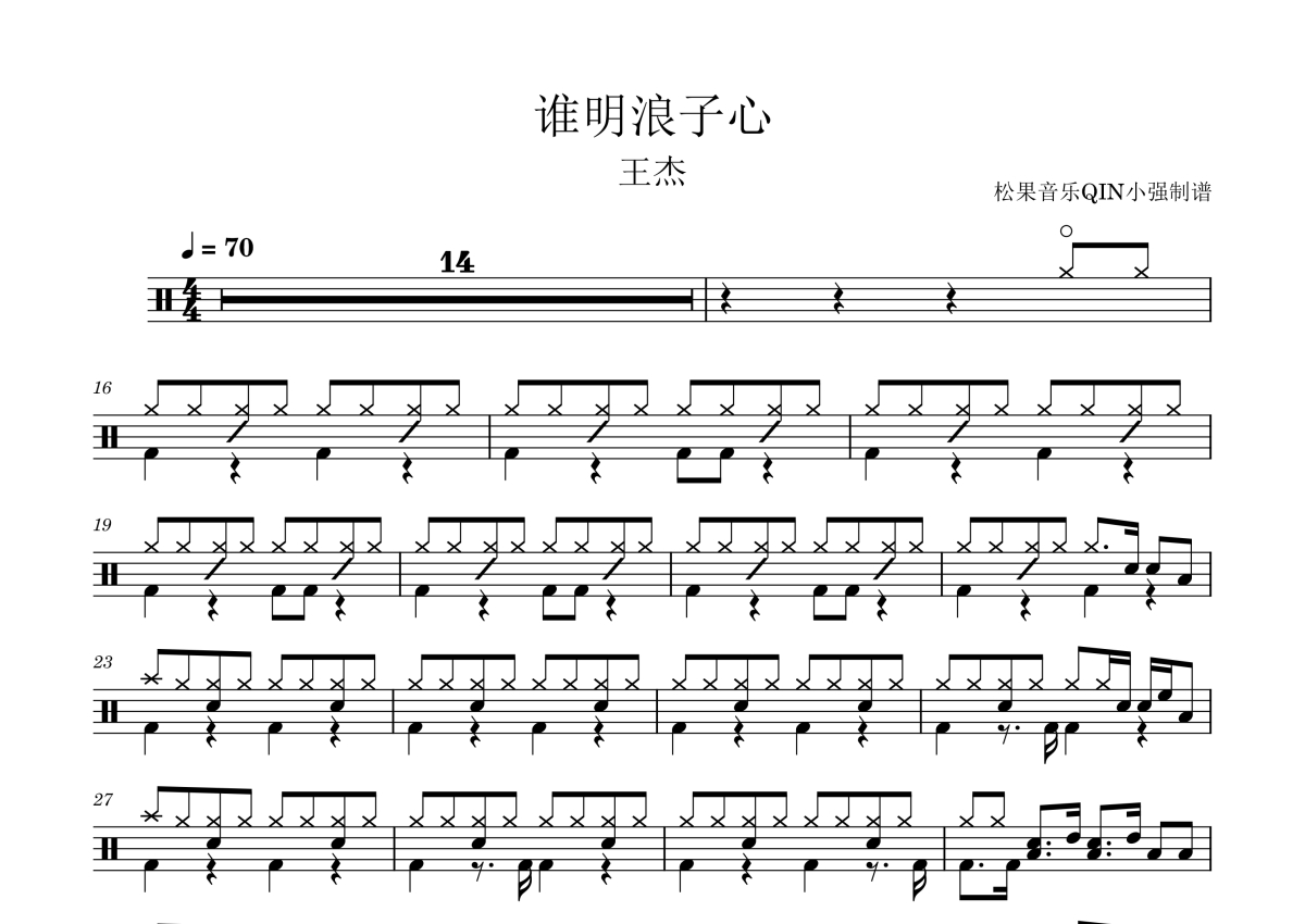 《谁明浪子心》是王杰演唱的一首歌曲,拍号为4/4拍,这份架子鼓谱共有两张高清图谱,图谱由 @松果音乐QIN小强 编配上传,图谱使用五线谱编配,使用这份谁明浪子心架子鼓谱,你将能够轻松地敲打出这首王杰的谁明浪子心,快来尝试吧。《谁明浪子心》是王杰演唱的粤语歌曲,由潘源良作词,王杰作曲,陈志远编曲。