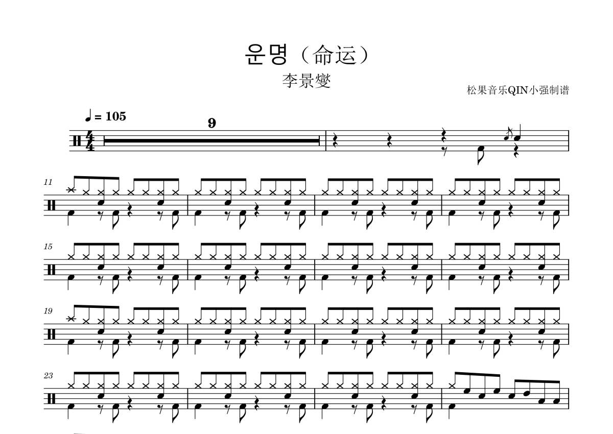 《운명(命运)》是命运演唱的一首歌曲,拍号为4/4拍,这份架子鼓谱共有三张高清图谱,图谱由 @松果音乐QIN小强 编配上传,图谱使用五线谱编配,使用这份운명(命运)架子鼓谱,你将能够轻松地敲打出这首命运的운명(命运),快来尝试吧。《命运》(韩语名:운명)是由韩国音乐人한성호(Han Sungho)作词、이경섭(Kyung Sub Lee)作曲并演唱的电视剧主题曲,收录于2004年7月19日发行的专辑《“浪漫满屋”电视原声大堞(Full House O.S.T)》中,作为KBS电视剧《浪漫满屋》的主题曲使用。