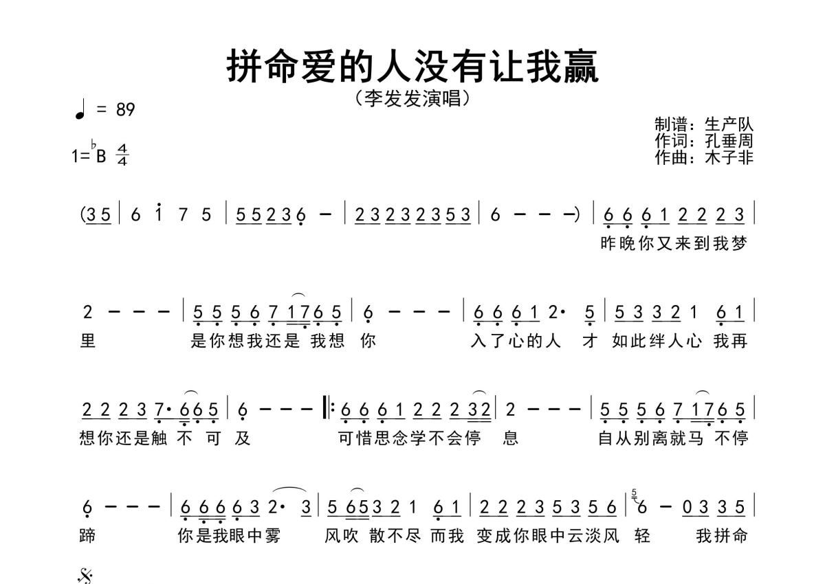《拼命爱的人没有让我赢》是李发发演唱的一首歌曲,原版简谱,拍号为4/4拍,歌曲速度为每分钟89拍,这份简谱共有一张高清图谱,图谱由 @生产队 编配上传李发发演唱的歌曲《拼命爱的人没有让我赢》原版简谱,完整的前奏、间奏、尾奏solo编配,精编完美版,优质推荐!。