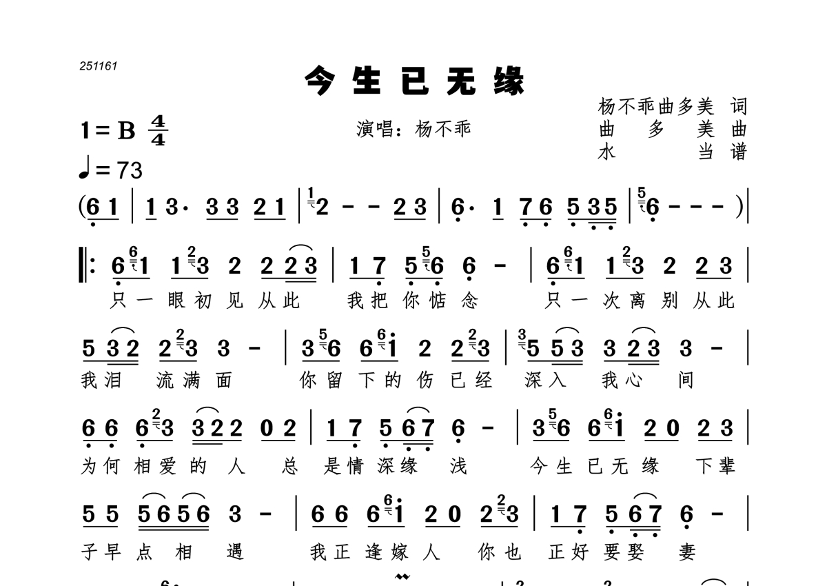 《今生已无缘》是杨不乖演唱的一首歌曲,拍号为4/4拍,歌曲速度为每分钟73拍,这份简谱共有一张高清图谱,图谱由 @水当 编配上传。