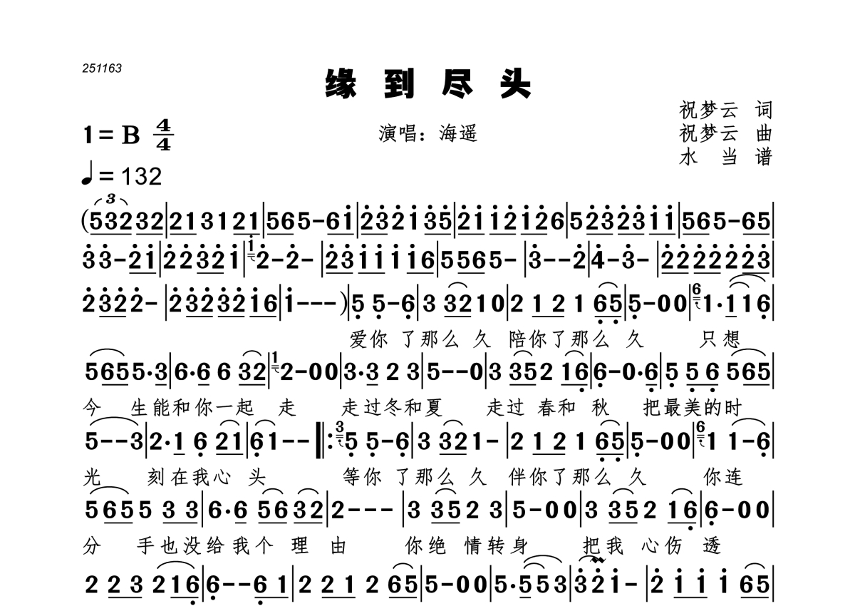 《缘到尽头》是海遥演唱的一首歌曲,拍号为4/4拍,歌曲速度为每分钟132拍,这份简谱共有一张高清图谱,图谱由 @水当 编配上传。