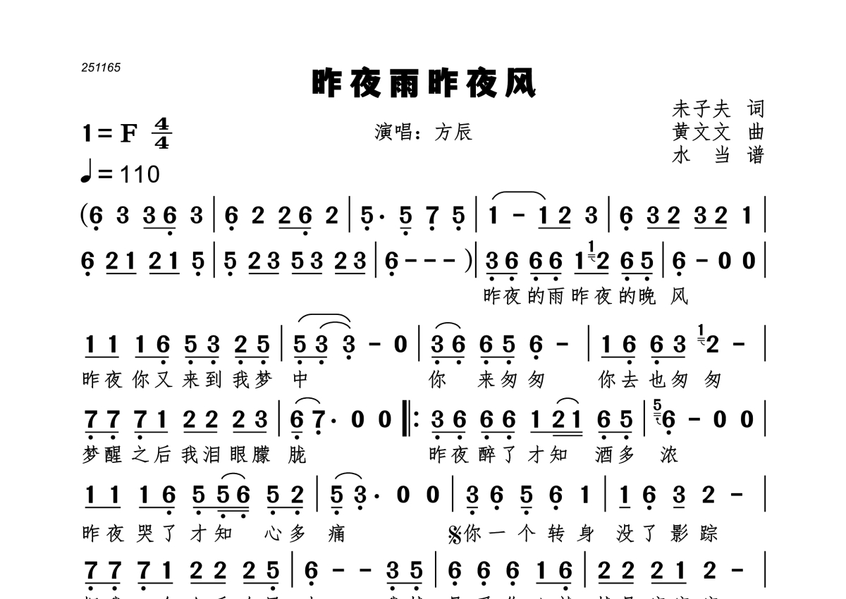《昨夜雨昨夜风》是方辰演唱的一首歌曲,拍号为4/4拍,歌曲速度为每分钟110拍,这份简谱共有一张高清图谱,图谱由 @水当 编配上传。
