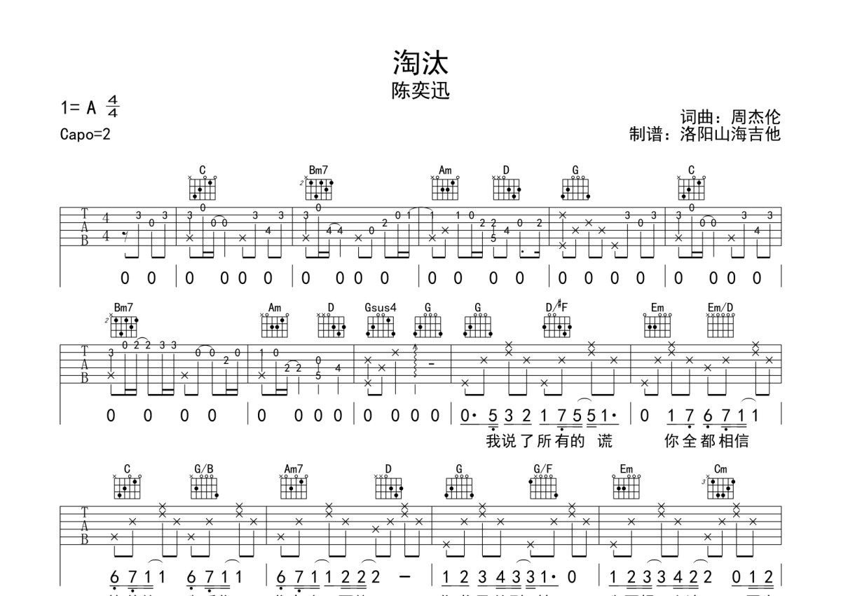 《淘汰》是陈奕迅演唱的一首歌曲,本吉他谱采用的是G调指法编配,这份吉他谱共有两张高清图谱,图谱由 @何奔洋 编配上传,图谱使用六线谱编配,包含吉他和弦指法、简谱以及歌词部分,曲谱配备了相关的音频提供试听,使用这份淘汰吉他谱,可以让你更加方便地掌握这首歌曲的弹唱技巧,快来尝试吧。
