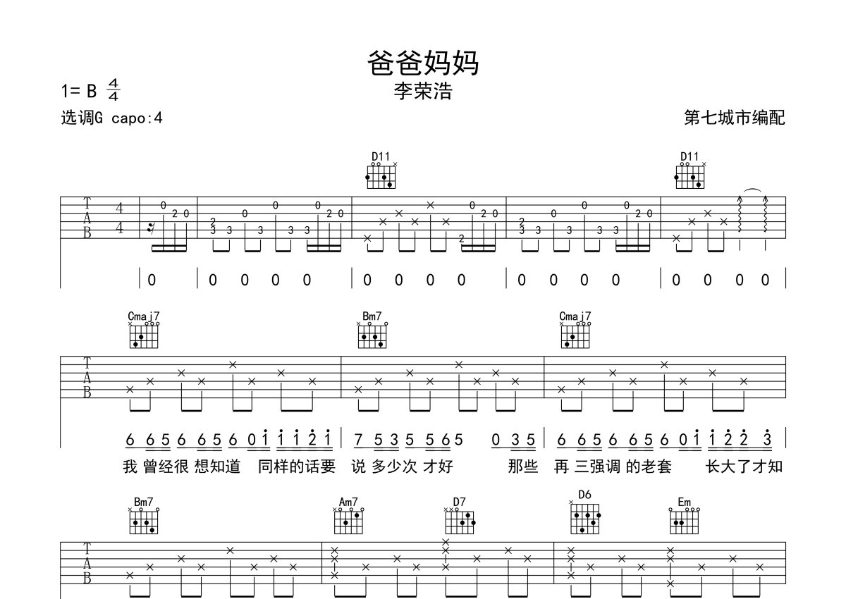 《爸爸妈妈》是李荣浩演唱的一首歌曲,本吉他谱采用的是G调指法编配,这份吉他谱共有两张高清图谱,图谱由 @第七城市 编配上传,图谱使用六线谱编配,包含吉他和弦指法、简谱以及歌词部分,使用这份爸爸妈妈吉他谱,可以让你更加方便地掌握这首歌曲的弹唱技巧,快来尝试吧。适合进阶的吉他玩家。