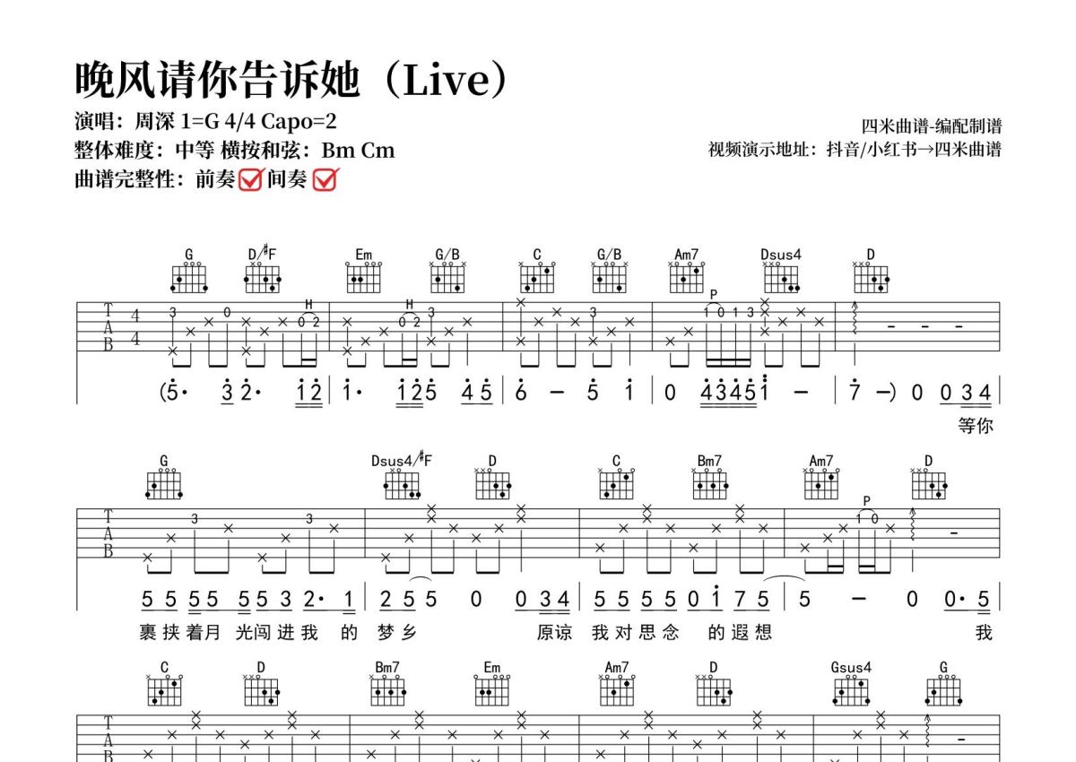 周深《晚风请你告诉她》吉他谱 - G调弹唱六线谱