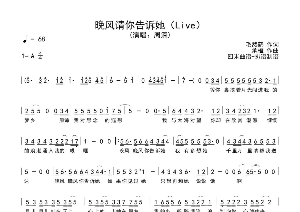 《晚风请你告诉她》是周深演唱的一首歌曲,拍号为4/4拍,这份简谱共有一张高清图谱,图谱由 @SRV7758521 编配上传。