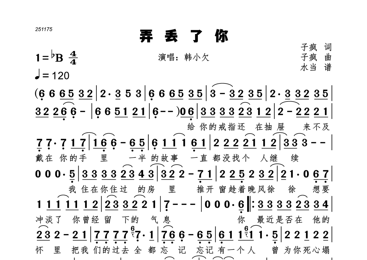 《弄丢了你》是韩小欠演唱的一首歌曲,拍号为4/4拍,歌曲速度为每分钟120拍,这份简谱共有一张高清图谱,图谱由 @水当 编配上传。