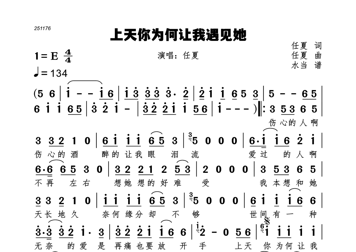 《上天你为何让我遇见她》是任夏演唱的一首歌曲,拍号为4/4拍,歌曲速度为每分钟134拍,这份简谱共有一张高清图谱,图谱由 @水当 编配上传。