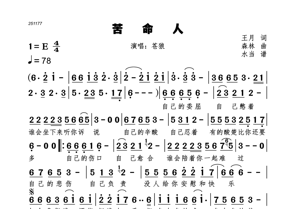 《苦命人》是苍狼演唱的一首歌曲,拍号为4/4拍,歌曲速度为每分钟78拍,这份简谱共有一张高清图谱,图谱由 @水当 编配上传。
