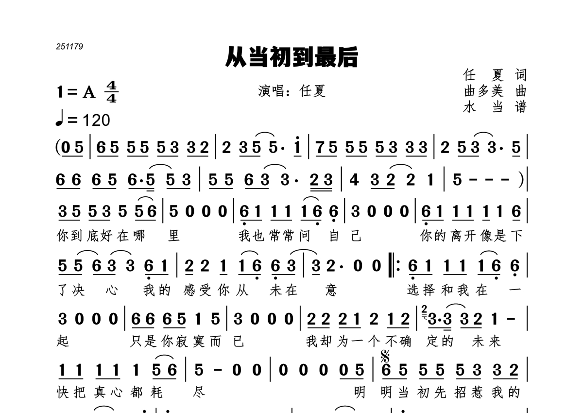从当初到最后简谱 - 任夏水当编配