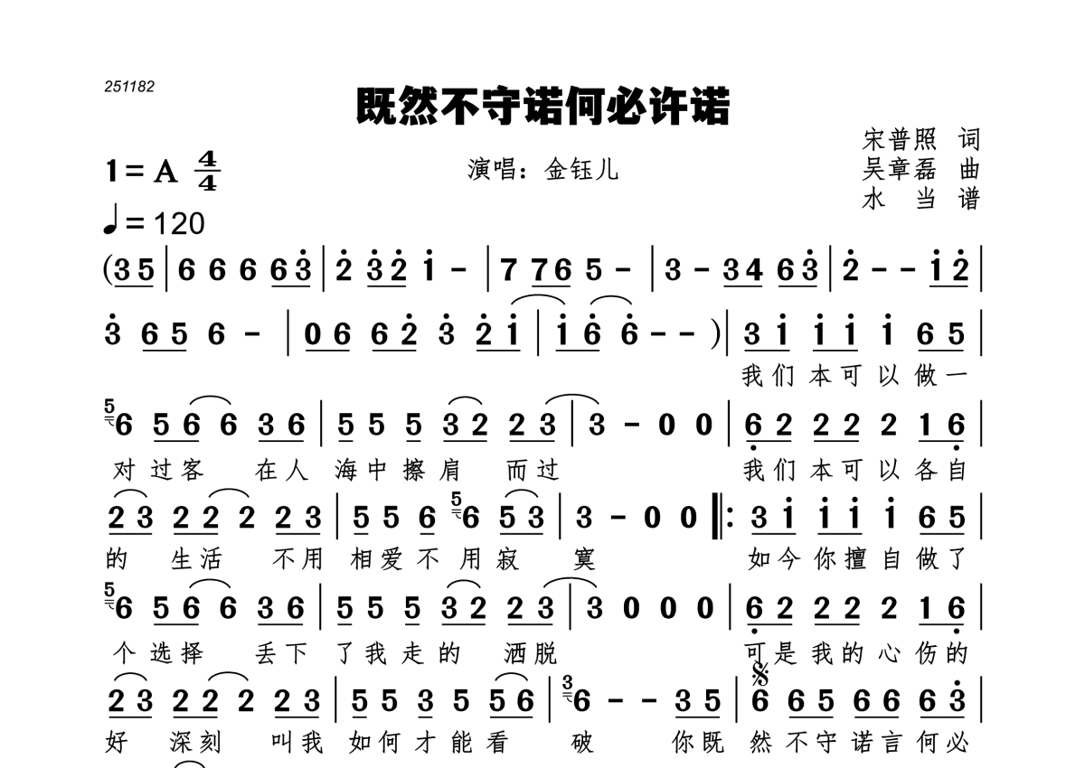 《既然不守诺何必许诺》是金钰儿演唱的一首歌曲,拍号为4/4拍,歌曲速度为每分钟120拍,这份简谱共有一张高清图谱,图谱由 @水当 编配上传。