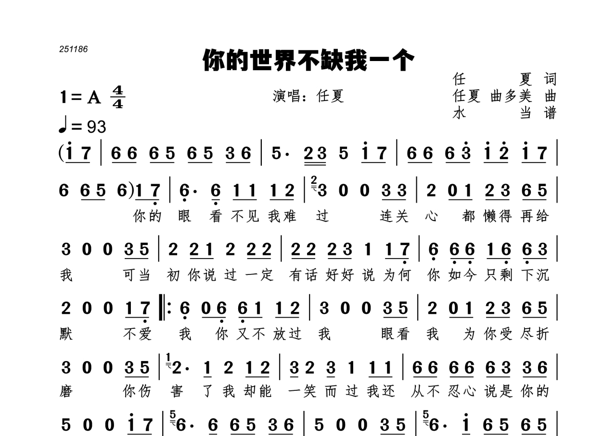 你的世界不缺我一个简谱 - 任夏演唱