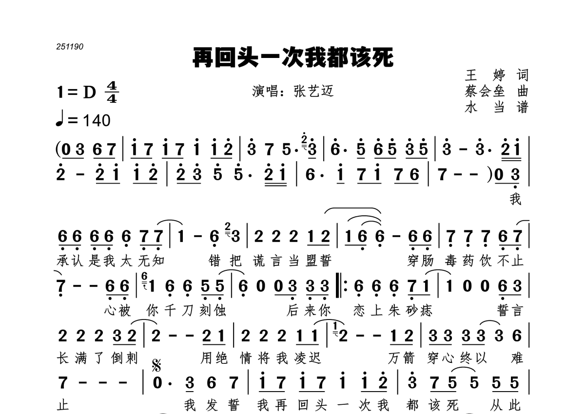 《再回头一次我都该死》是张艺迈演唱的一首歌曲,拍号为4/4拍,歌曲速度为每分钟140拍,这份简谱共有一张高清图谱,图谱由 @水当 编配上传。