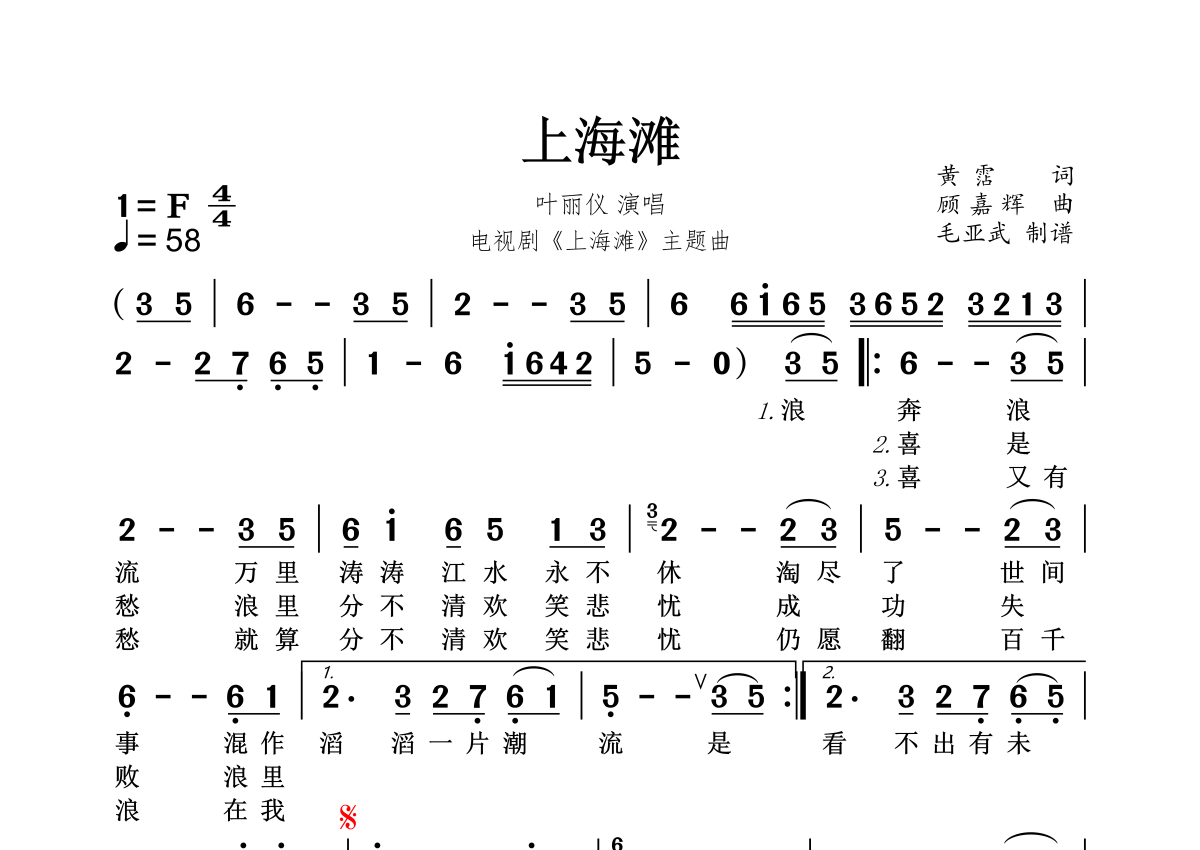 上海滩简谱 - 叶丽仪演唱