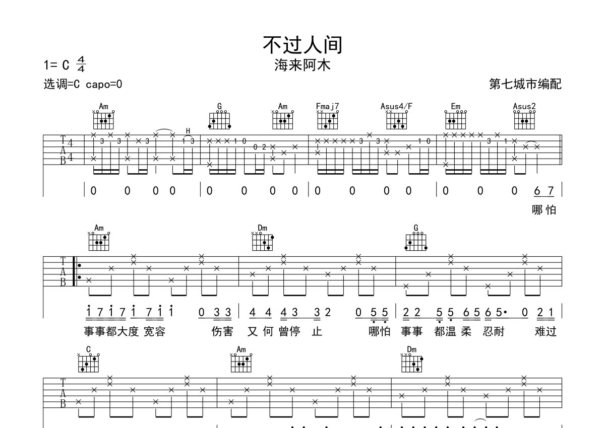 海来阿木《不过人间》吉他谱 - C调弹唱六线谱