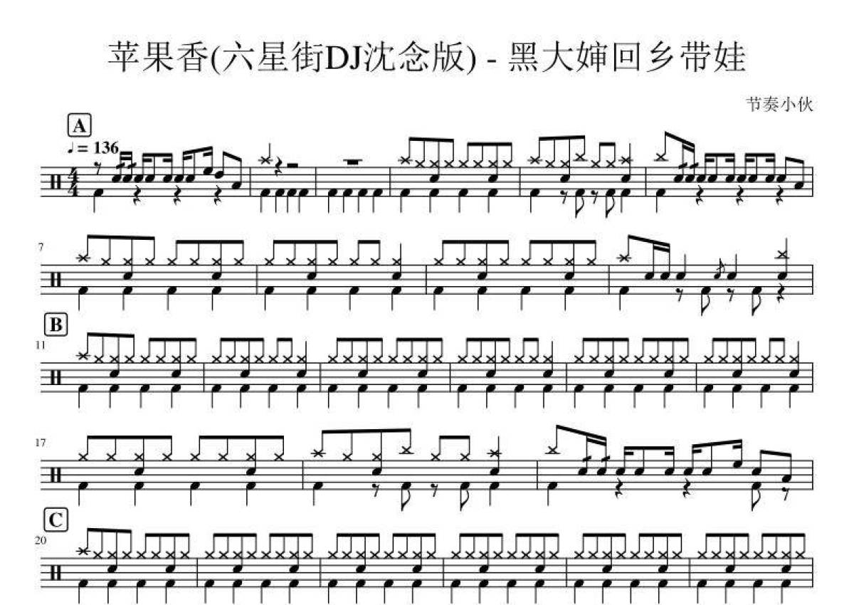 《苹果香(六星街DJ沈念版) -》是黑大婶回乡带娃演唱的一首歌曲,拍号为4/4拍,这份架子鼓谱共有三张高清图谱,图谱由 @节奏小伙 编配上传,图谱使用五线谱编配,使用这份苹果香(六星街DJ沈念版) -架子鼓谱,你将能够轻松地敲打出这首黑大婶回乡带娃的苹果香(六星街DJ沈念版) -,快来尝试吧。