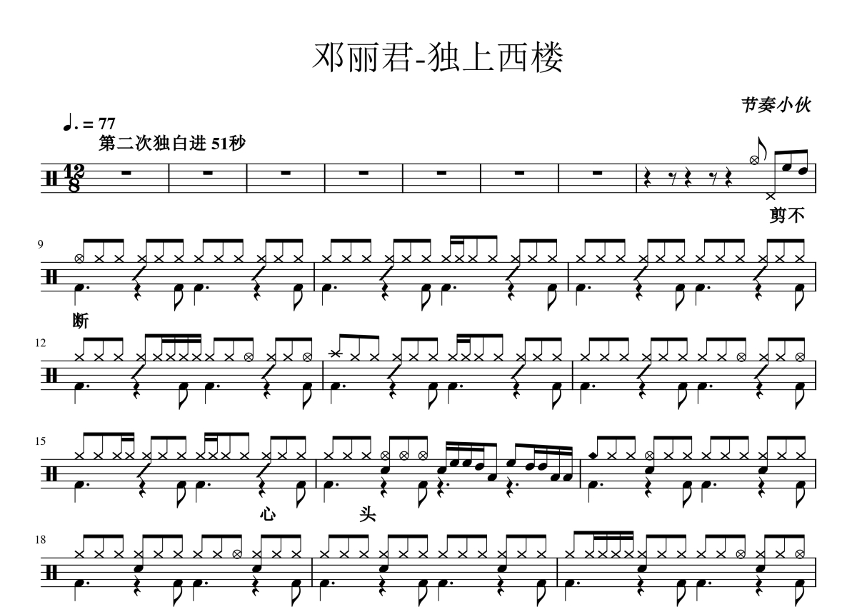 《独上西楼》是邓丽君演唱的一首歌曲,这份架子鼓谱共有一张高清图谱,图谱由 @节奏小伙 编配上传,图谱使用五线谱编配,使用这份独上西楼架子鼓谱,你将能够轻松地敲打出这首邓丽君的独上西楼,快来尝试吧。