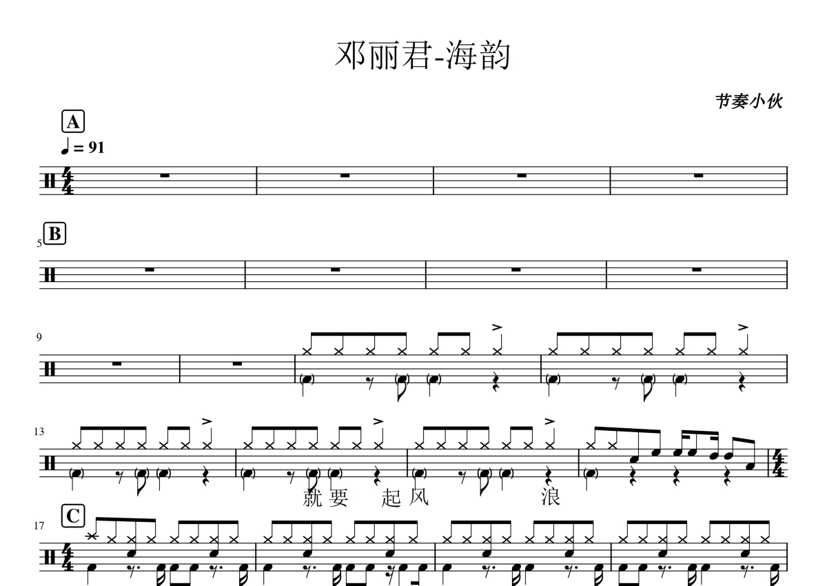 《海韵》是邓丽君演唱的一首歌曲,这份架子鼓谱共有两张高清图谱,图谱由 @节奏小伙 编配上传,图谱使用五线谱编配,使用这份海韵架子鼓谱,你将能够轻松地敲打出这首邓丽君的海韵,快来尝试吧。