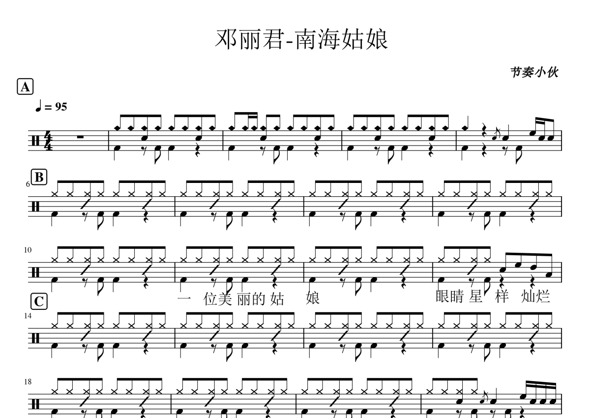 《南海姑娘》是邓丽君演唱的一首歌曲,这份架子鼓谱共有两张高清图谱,图谱由 @节奏小伙 编配上传,图谱使用五线谱编配,使用这份南海姑娘架子鼓谱,你将能够轻松地敲打出这首邓丽君的南海姑娘,快来尝试吧。