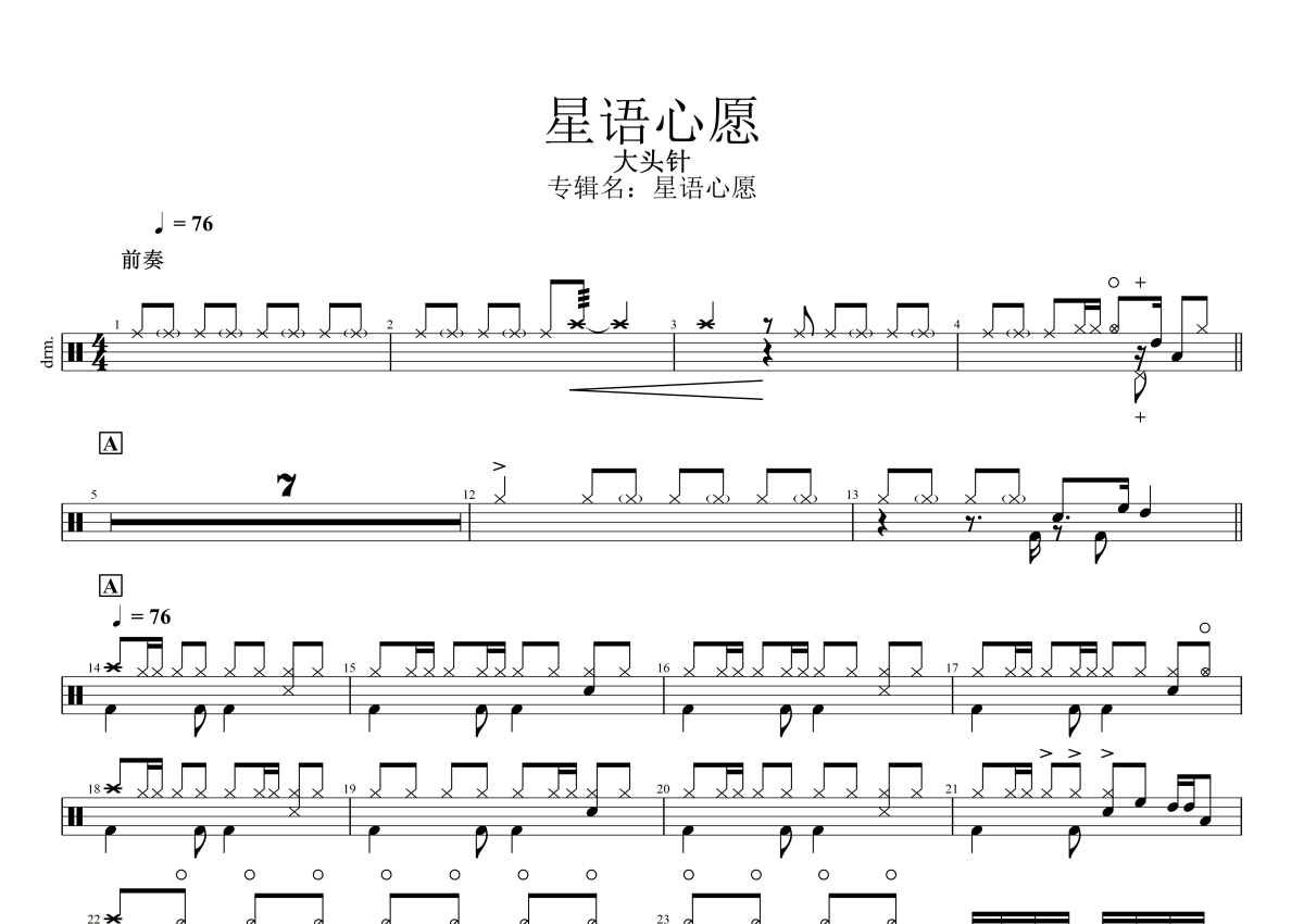 大头针《星语心愿》架子鼓谱