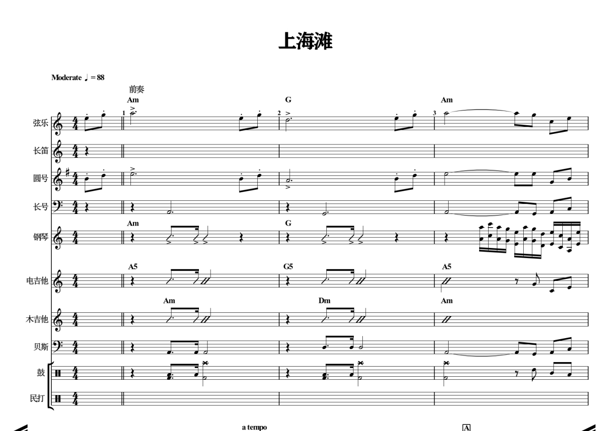《上海滩》是叶丽仪演唱的一首歌曲,原版乐团谱,拍号为4/4拍,歌曲速度为每分钟88拍,这份乐队总谱共有九张高清图谱,图谱由 @石头音乐 编配上传原版乐团谱包含键盘弦乐,钢琴,圆号,长号,长笛,电吉他,木吉他,贝斯,鼓与打击乐各声部分谱。