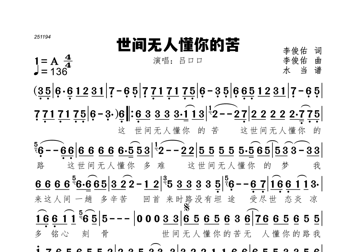 《世间无人懂你的苦》是吕口口演唱的一首歌曲,歌曲速度为每分钟136拍,这份简谱共有一张高清图谱,图谱由 @水当 编配上传。