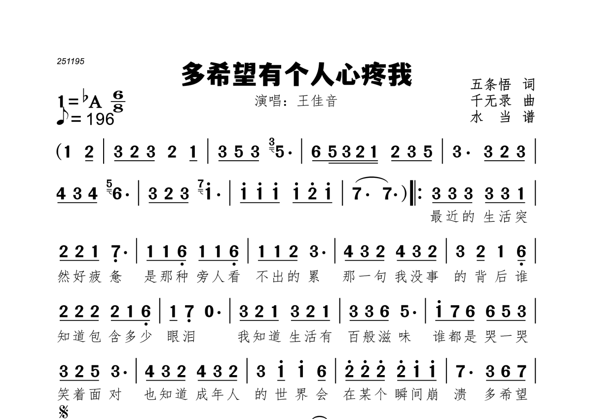 《多希望有个人心疼我》是王佳音演唱的一首歌曲,拍号为6/8拍,歌曲速度为每分钟196拍,这份简谱共有一张高清图谱,图谱由 @水当 编配上传。