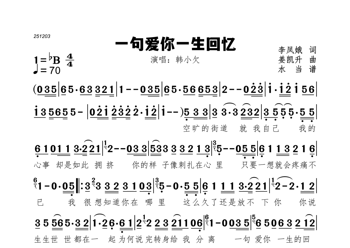 一句爱你一生回忆简谱 - 韩小欠演唱