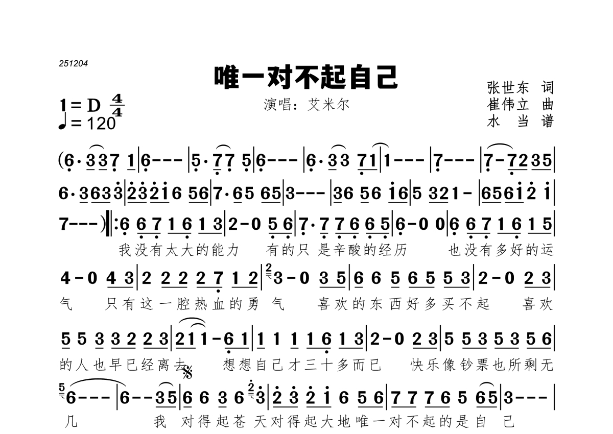 《唯一对不起自己》是艾米尔演唱的一首歌曲,拍号为4/4拍,歌曲速度为每分钟120拍,这份简谱共有一张高清图谱,图谱由 @水当 编配上传。