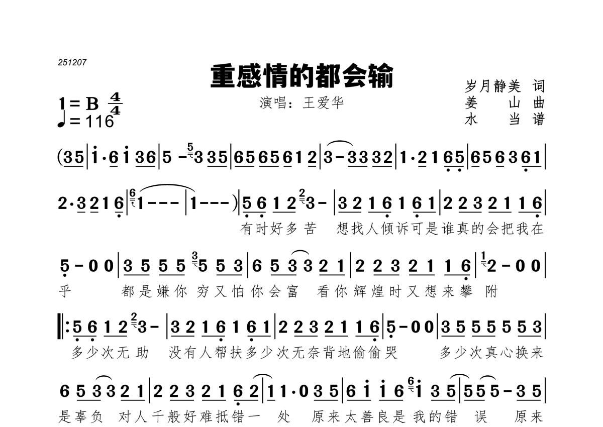 《重感情的都会输》是王爱华演唱的一首歌曲,拍号为4/4拍,歌曲速度为每分钟116拍,这份简谱共有一张高清图谱,图谱由 @水当 编配上传。