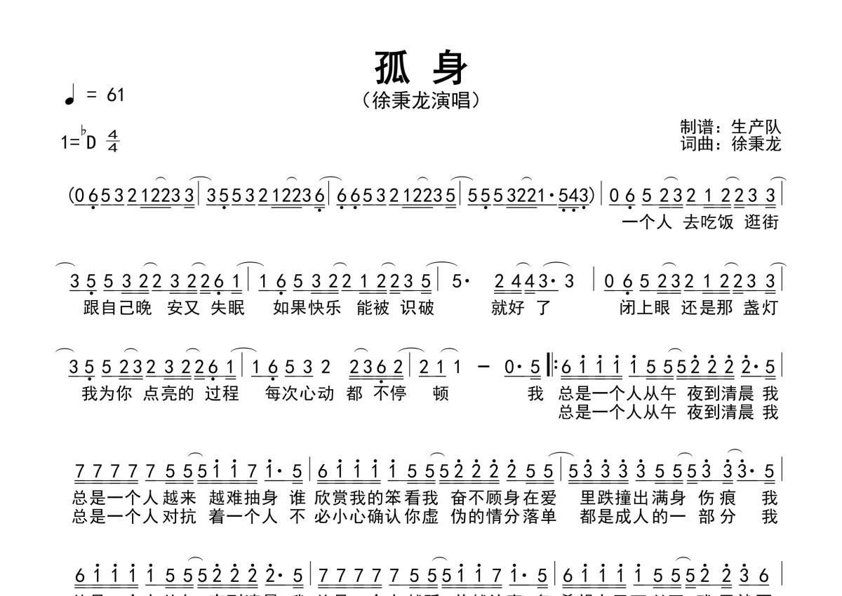 《孤身》是徐秉龙演唱的一首歌曲,原版简谱,拍号为4/4拍,歌曲速度为每分钟61拍,这份简谱共有一张高清图谱,图谱由 @生产队 编配上传徐秉龙作词、作曲并演唱的歌曲《孤身》原版简谱,完整的前奏、间奏、尾奏solo编配,精编完美版,优质推荐!。