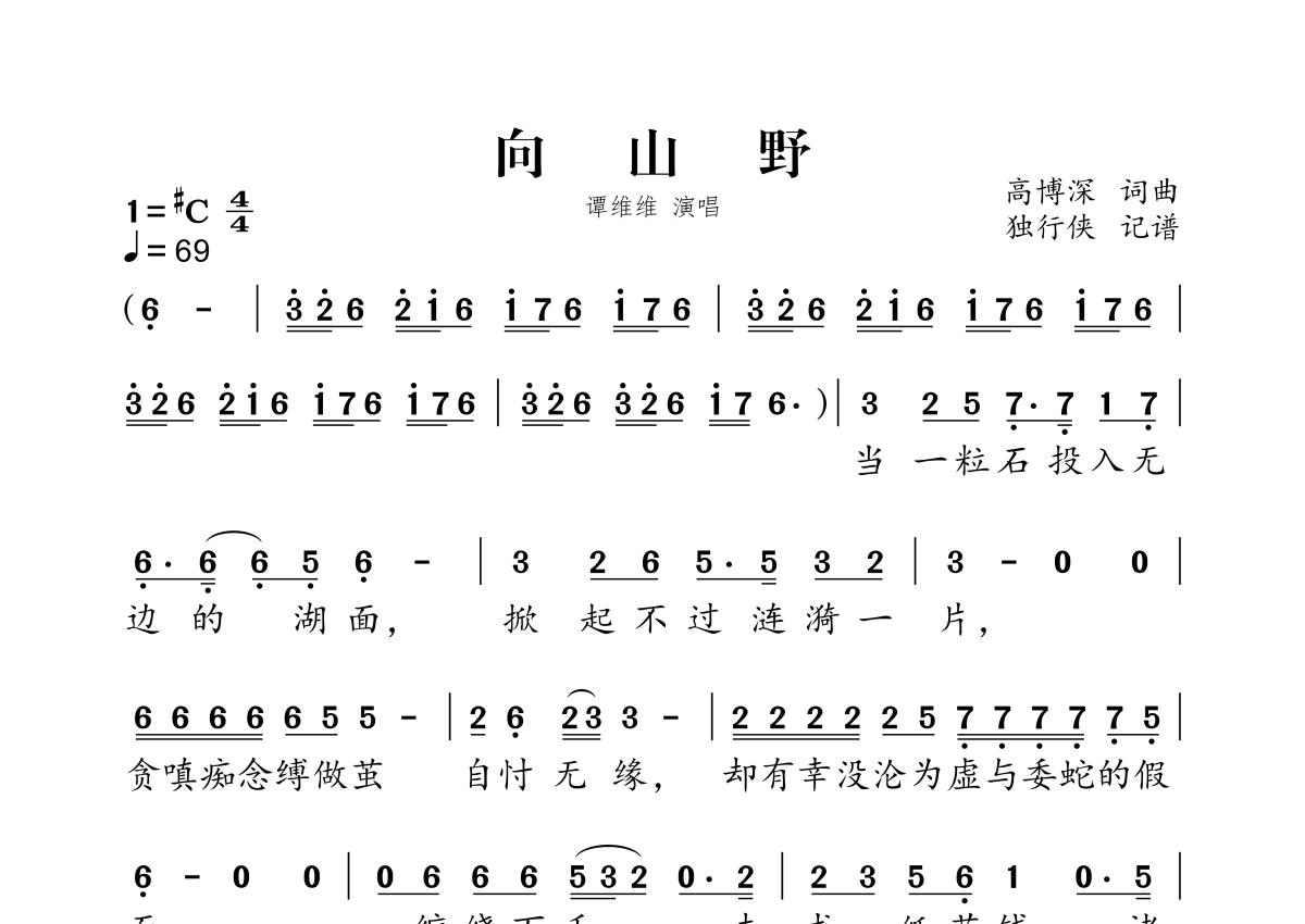 《向山野》是谭维维演唱的一首歌曲,拍号为4/4拍,歌曲速度为每分钟69拍,这份简谱共有两张高清图谱,图谱由 @独行侠 编配上传。