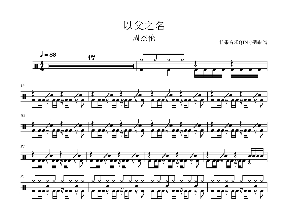 《以父之名》是周杰伦演唱的一首歌曲,拍号为4/4拍,这份架子鼓谱共有三张高清图谱,图谱由 @松果音乐QIN小强 编配上传,图谱使用五线谱编配,使用这份以父之名架子鼓谱,你将能够轻松地敲打出这首周杰伦的以父之名,快来尝试吧。《以父之名》是周杰伦演唱的古典说唱歌曲,由黄俊郎作词,周杰伦作曲,洪敬尧编曲。