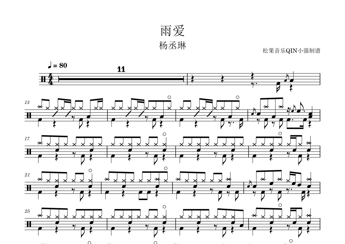 《雨爱》是杨丞琳演唱的一首歌曲,拍号为4/4拍,这份架子鼓谱共有两张高清图谱,图谱由 @松果音乐QIN小强 编配上传,图谱使用五线谱编配,使用这份雨爱架子鼓谱,你将能够轻松地敲打出这首杨丞琳的雨爱,快来尝试吧。《雨爱》是杨丞琳演唱的摇滚歌曲,由Wonderful作词,金大洲作曲,黄宣铭编曲,收录于杨丞琳2010年1月4日发行的专辑《Rainie & Love....? 雨爱》中。