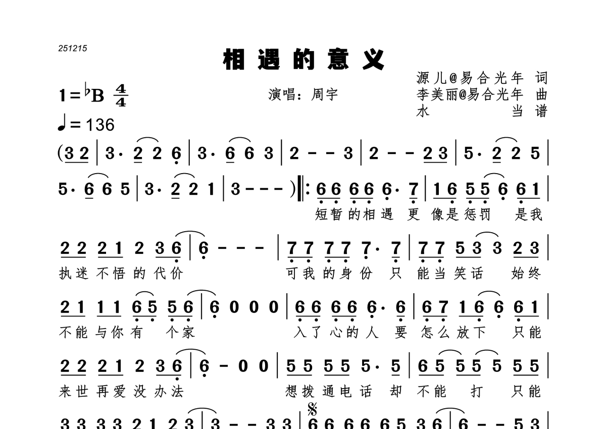 《相遇的意义》是周宇演唱的一首歌曲,拍号为4/4拍,歌曲速度为每分钟136拍,这份简谱共有一张高清图谱,图谱由 @水当 编配上传。