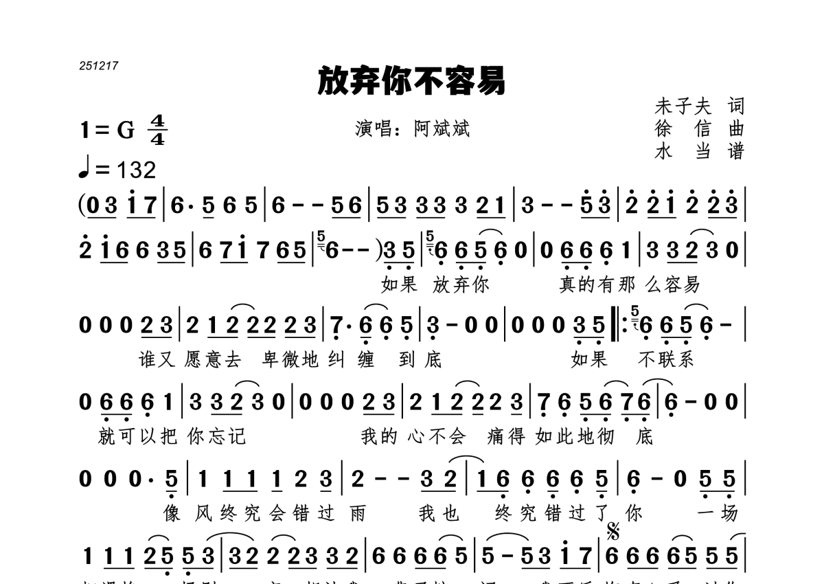 《放弃你不容易》是阿斌斌演唱的一首歌曲,拍号为4/4拍,歌曲速度为每分钟132拍,这份简谱共有一张高清图谱,图谱由 @水当 编配上传。