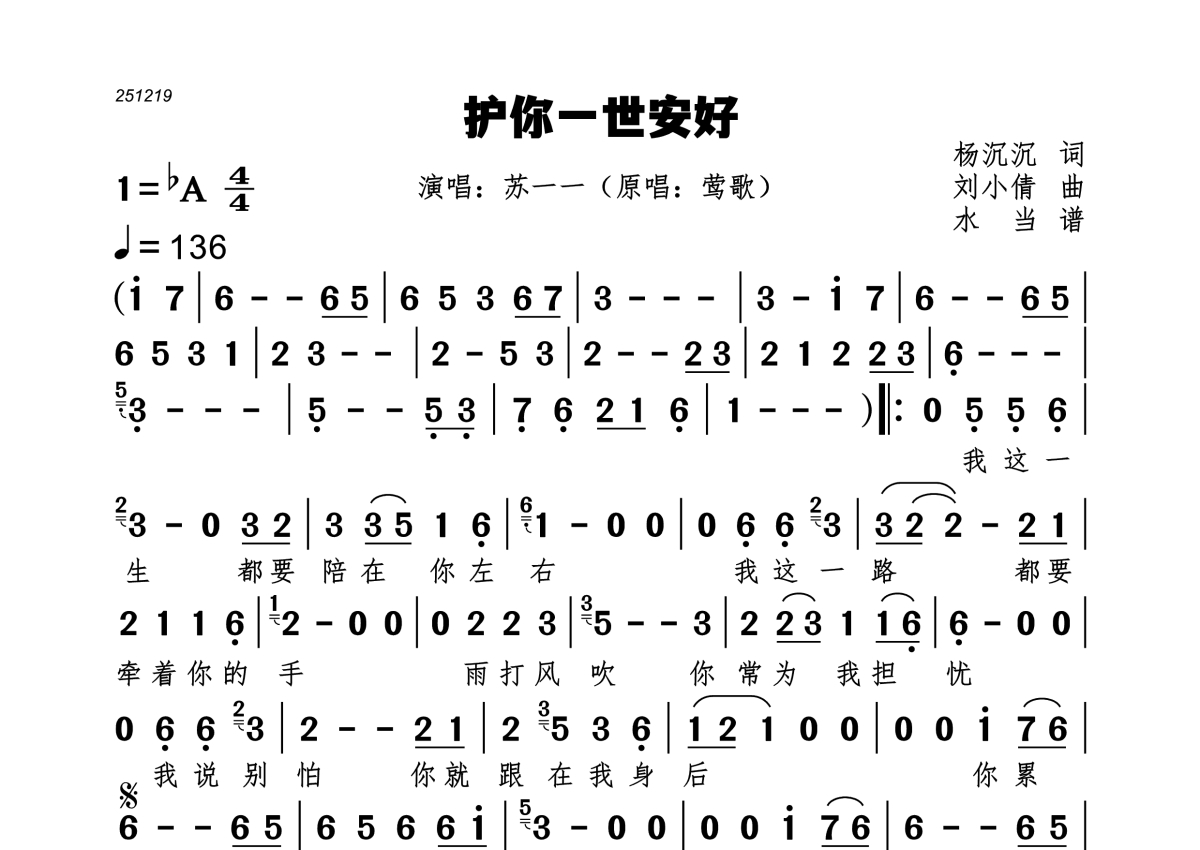 护你一世安好简谱 - 苏一一演唱