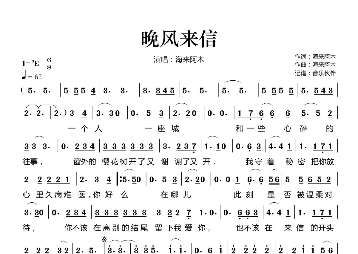 《晚风来信》是海来阿木演唱的一首歌曲,拍号为6/8拍,歌曲速度为每分钟62拍,这份简谱共有一张高清图谱,图谱由 @音乐伙伴 编配上传。