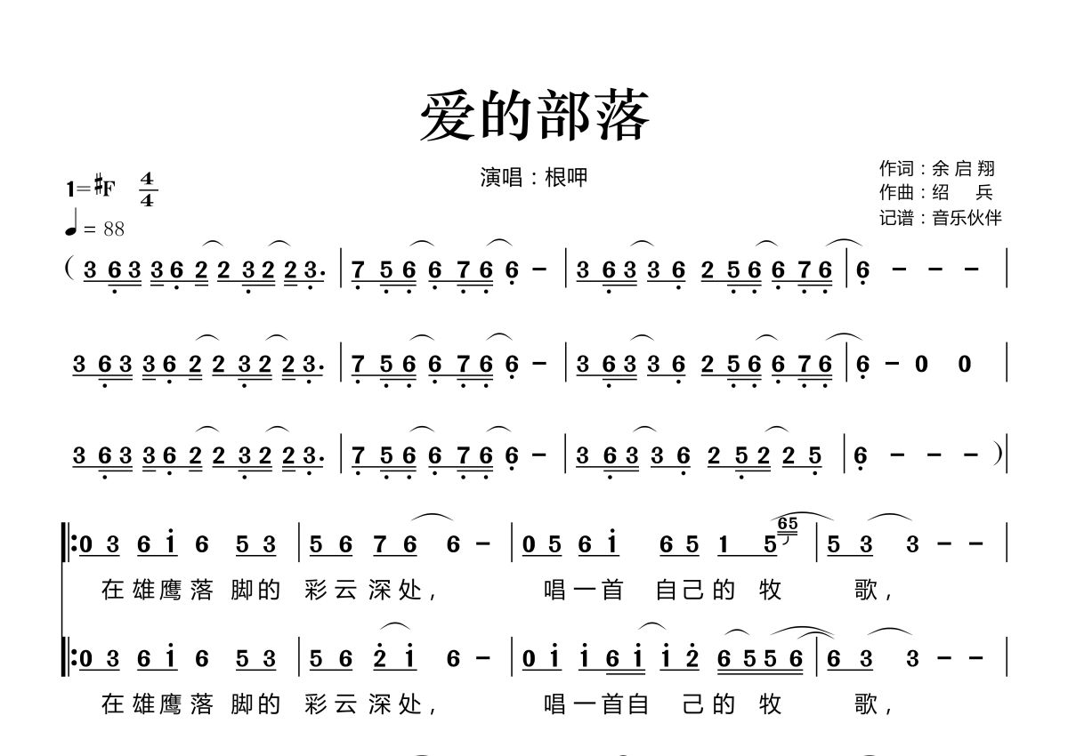 《爱的部落》是根呷演唱的一首歌曲,拍号为4/4拍,歌曲速度为每分钟88拍,这份简谱共有两张高清图谱,图谱由 @音乐伙伴 编配上传。