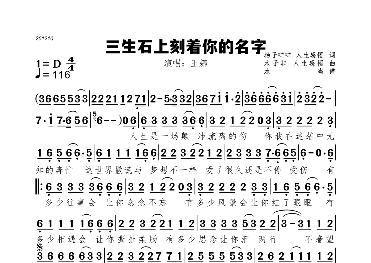 《三生石上刻着你的名字》是王娜演唱的一首歌曲,拍号为4/4拍,歌曲速度为每分钟116拍,这份简谱共有一张高清图谱,图谱由 @水当 编配上传。