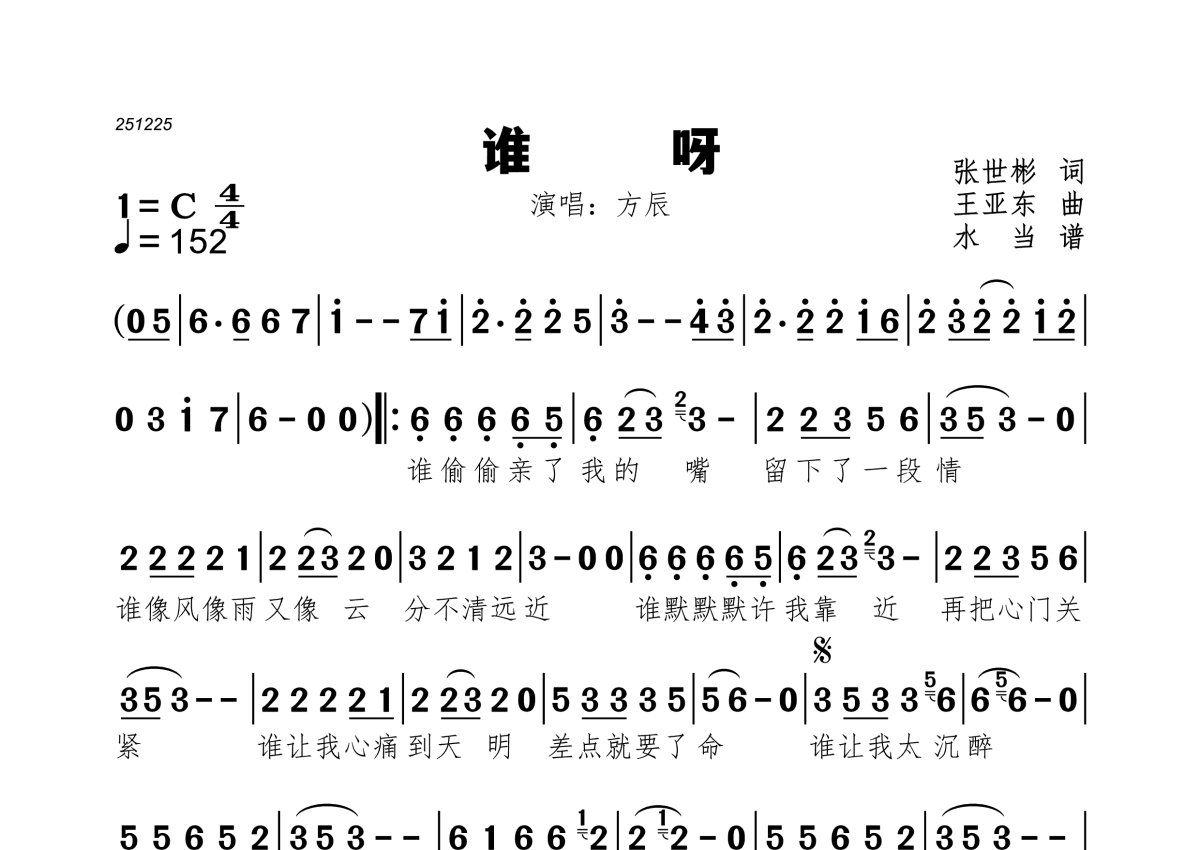 《谁呀》是方辰演唱的一首歌曲,拍号为4/4拍,歌曲速度为每分钟152拍,这份简谱共有一张高清图谱,图谱由 @水当 编配上传。