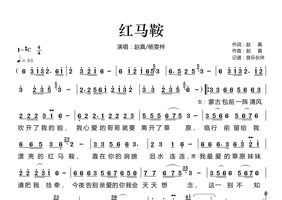 红马鞍简谱 - 赵真/杨雯梓演唱