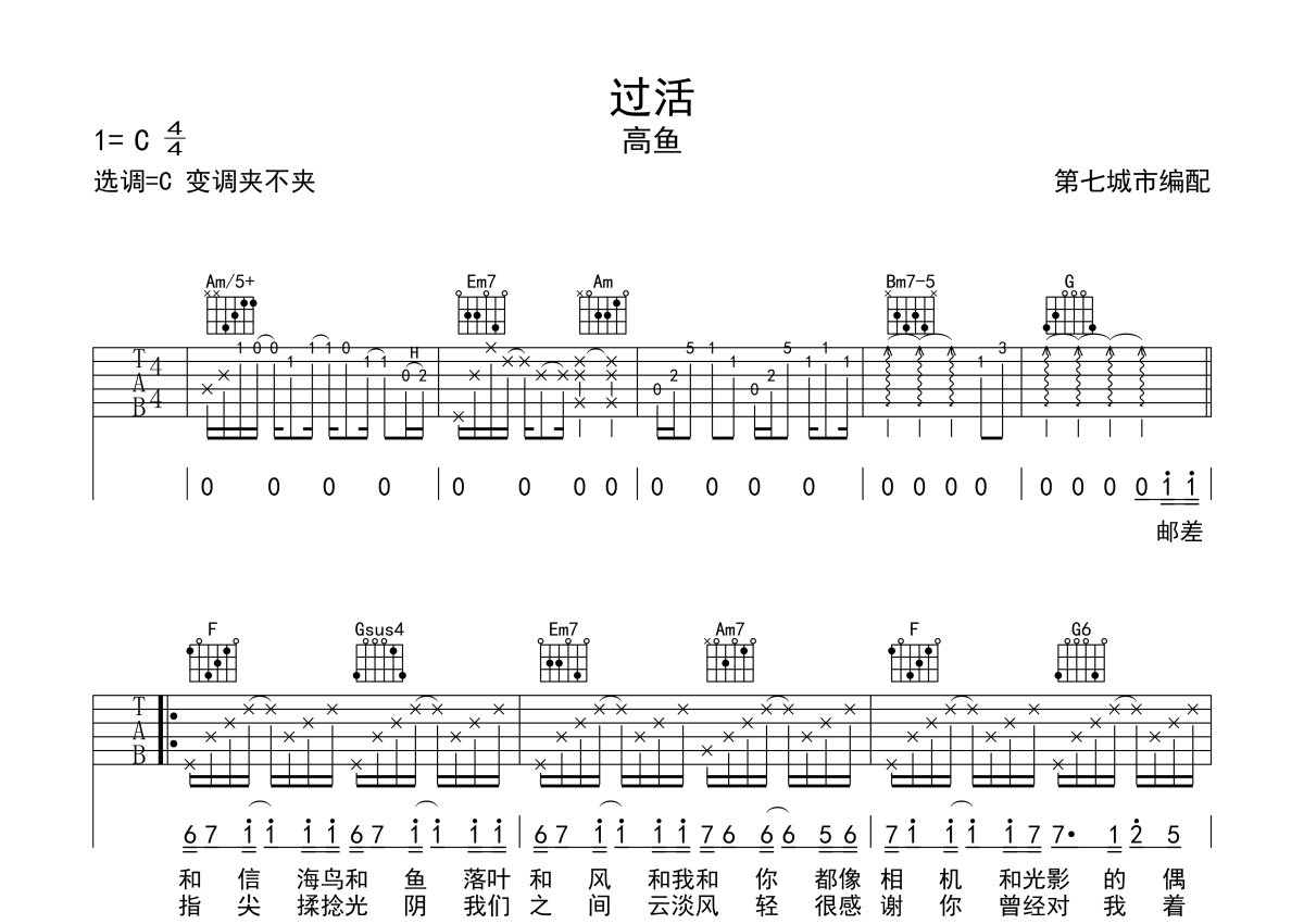 高鱼《过活》吉他谱 - C调弹唱六线谱