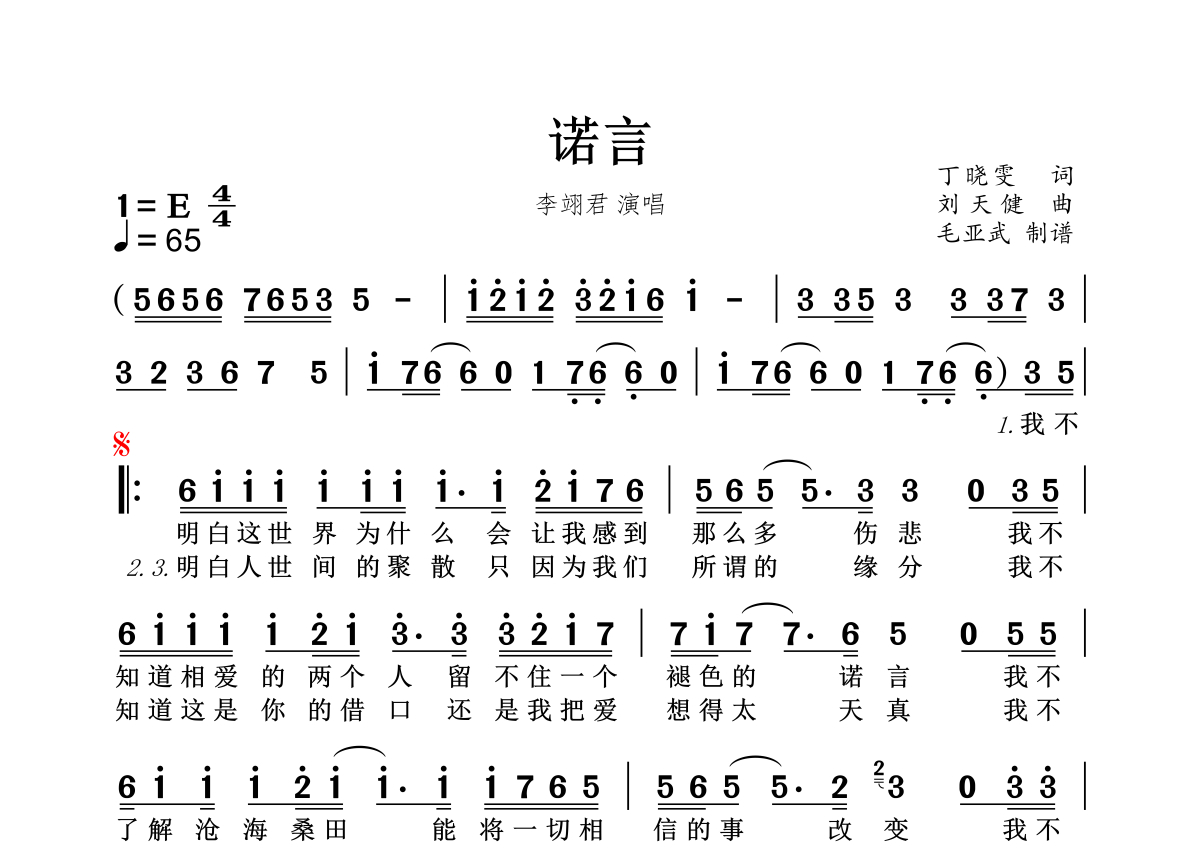 《诺言》是李翊君演唱的一首歌曲,拍号为4/4拍,这份简谱共有两张高清图谱,图谱由 @秋天的童话 编配上传。