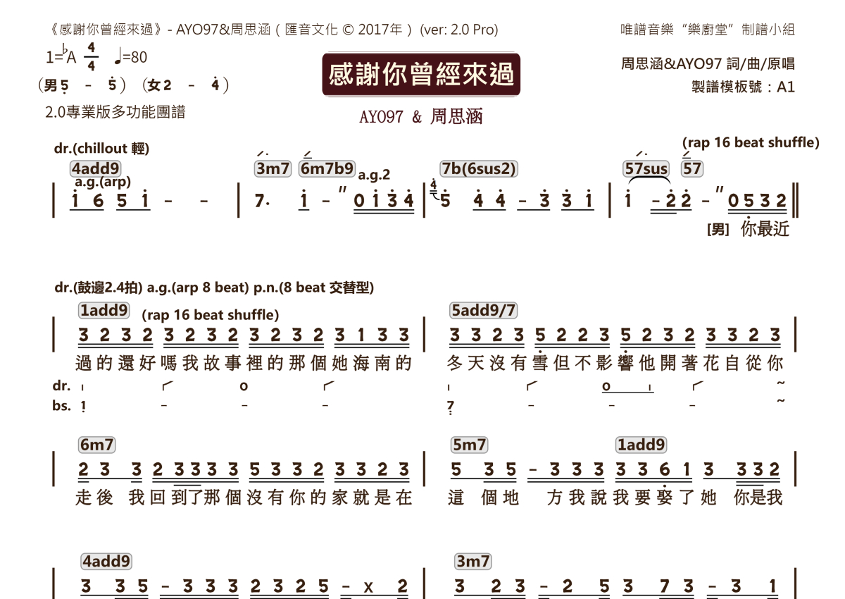 感谢你曾来过乐队总谱 - Ayo97 周思涵演唱 - 2.0版多功能团谱