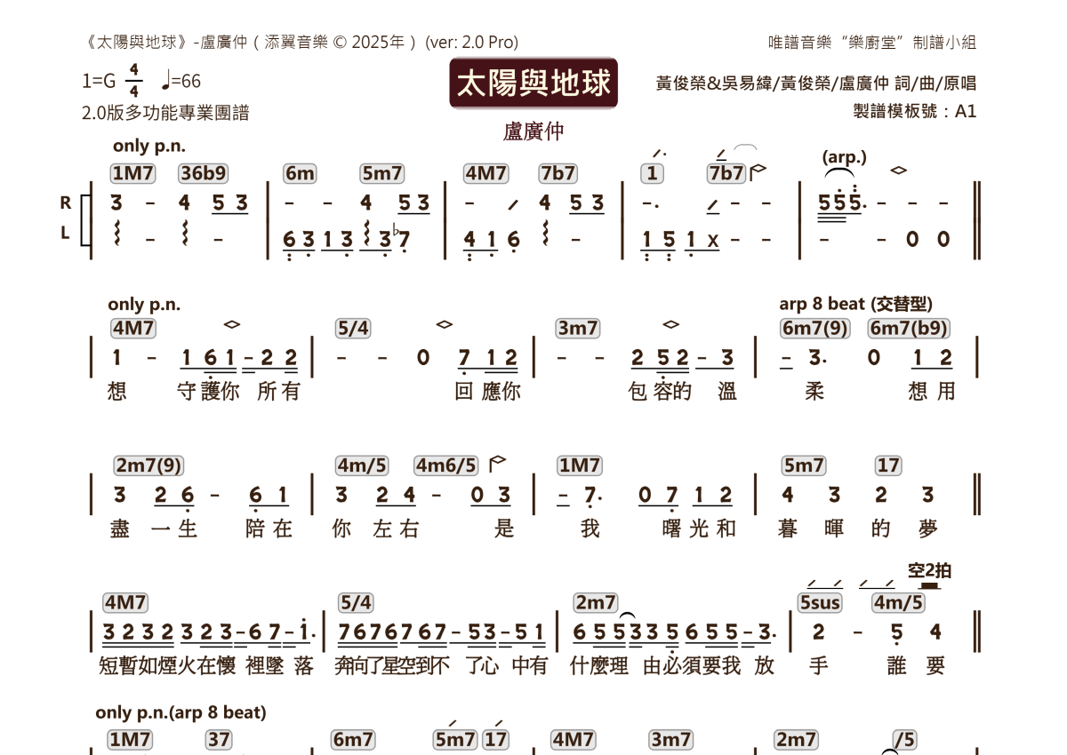 《太阳与地球》是卢广仲演唱的一首歌曲,2.0版多功能团谱,这份乐队总谱共有两张高清图谱,图谱由 @唯谱音乐"乐厨堂"发布小组 编配上传。