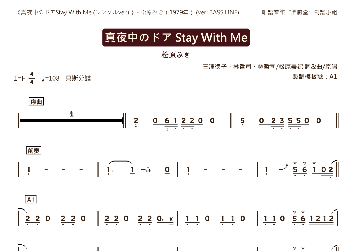 《真夜中のドアStay With Me (シングルver.)》是松原みき演唱的一首歌曲,贝斯分谱,这份乐队总谱共有三张高清图谱,图谱由 @唯谱音乐"乐厨堂"发布小组 编配上传。