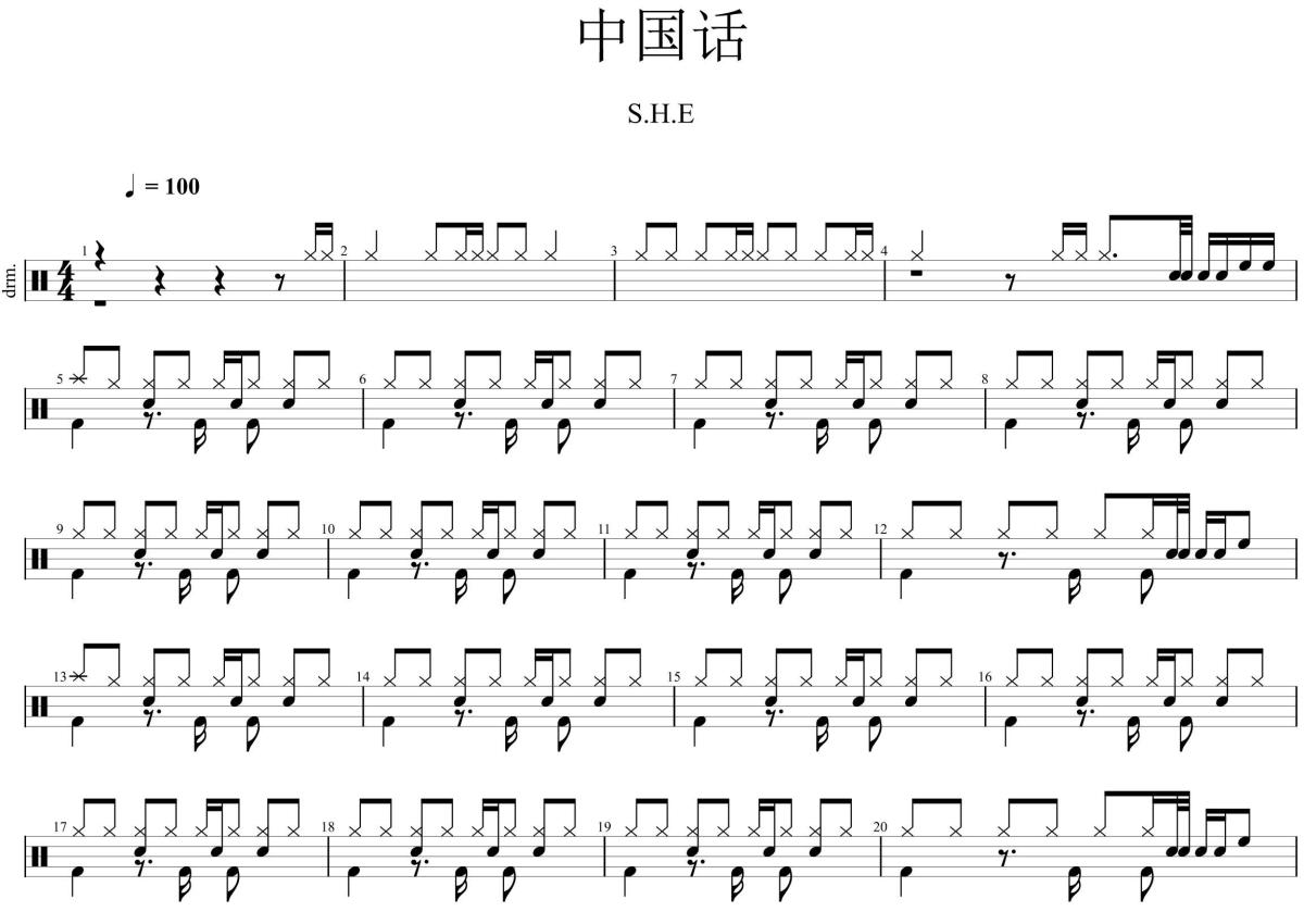 《中国话》是S演唱的一首歌曲,这份架子鼓谱共有两张高清图谱,图谱由 @良好市民 编配上传,图谱使用五线谱编配,使用这份中国话架子鼓谱,你将能够轻松地敲打出这首S的中国话,快来尝试吧。