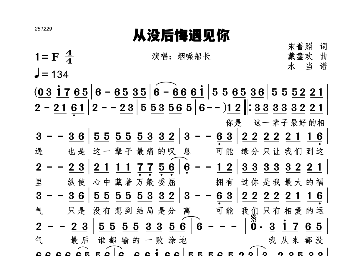 《从没后悔遇见你》是烟嗓船长演唱的一首歌曲,拍号为4/4拍,歌曲速度为每分钟134拍,这份简谱共有一张高清图谱,图谱由 @水当 编配上传。